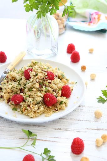 - Fold parsley, hazelnuts, barberries and raspberries gently into hot quinoa. Season and serve warm or room temperature.